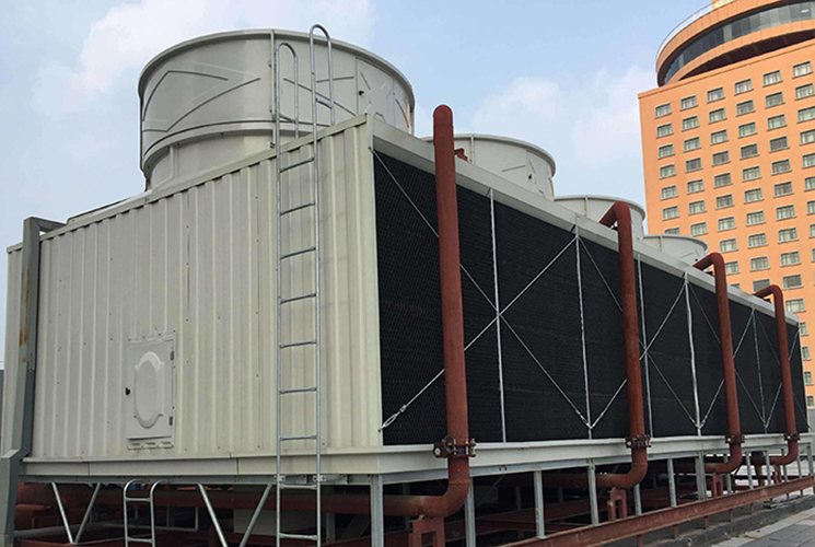 本系列横流式方玻璃钢冷却塔采用两侧进风,靠顶部的风机,使空气轻由塔两侧的填料,与热水进行介质交换,温热空气再排向塔外。填料采用两面有凸点的点波片,通过安装头使点波片粘结成整体,以提高刚性,两面的凸点还可避免直接滴水,因此提高了水膜形成能力,填料尾部设有收水措施。